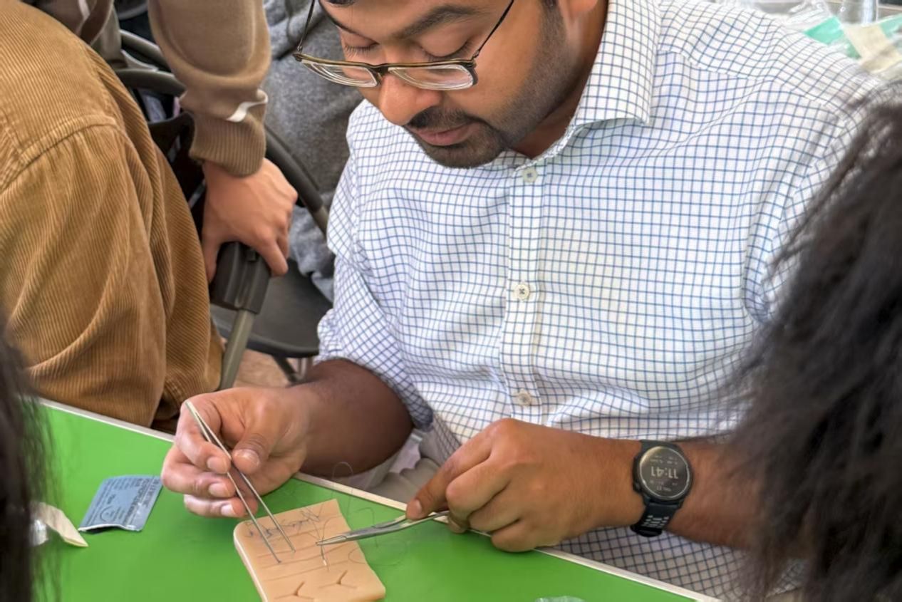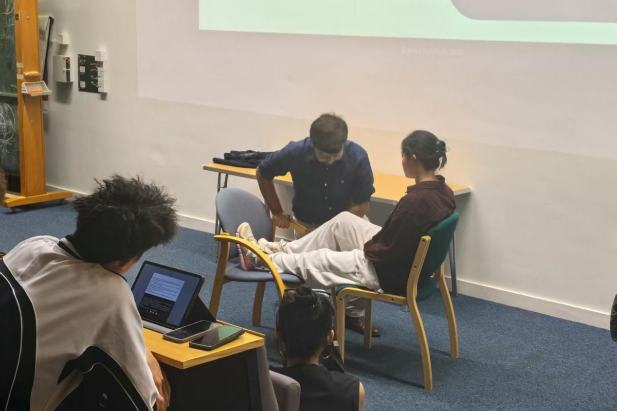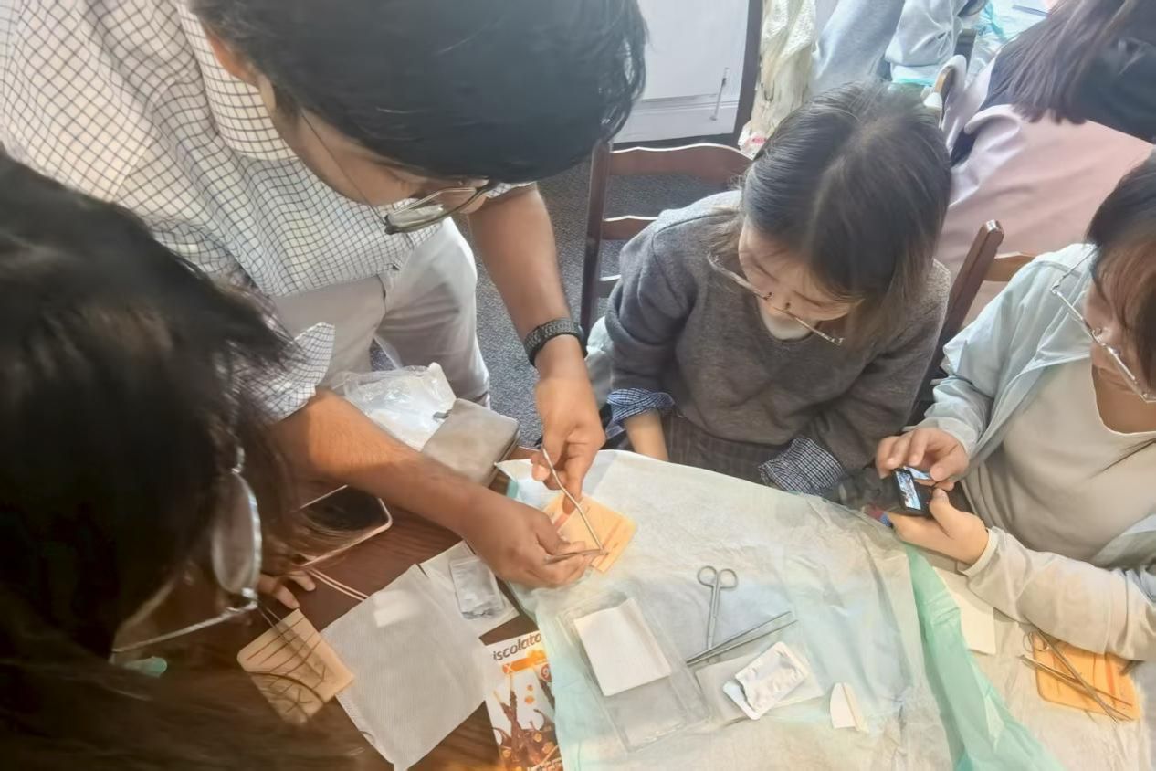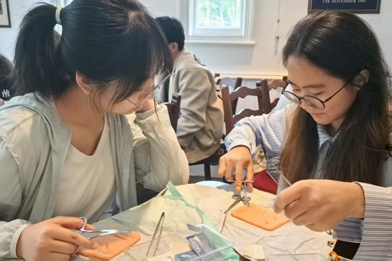 第二周课程聚焦系统临床技能培训,开设《临床缝合技术》《膝关节肌肉骨骼检查》等实操课程,课程内容兼具学术厚度、前沿锐度与互动活力,通过理论与临床的深度结合,全面提升学生的技能水平与临床思维。教授示范后,学生分组练习并获现场针对性指导,临床操作能力得到切实提升。