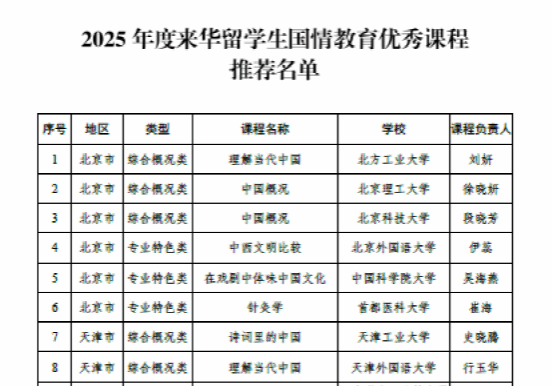 近日,中国教育国际交流协会公布了2025 年度来华留学生国情教育优秀课程和中外青少年社会实践活动基地的入选名单。该评选经由学校申请、地方推荐、专家审核,共有121门课程入选优秀课程名单,124个基地推荐为国情教育基地。我校推荐申报的专业特色类课程《中医学》入选2025来华留学生国情教育优秀课程推荐名单。