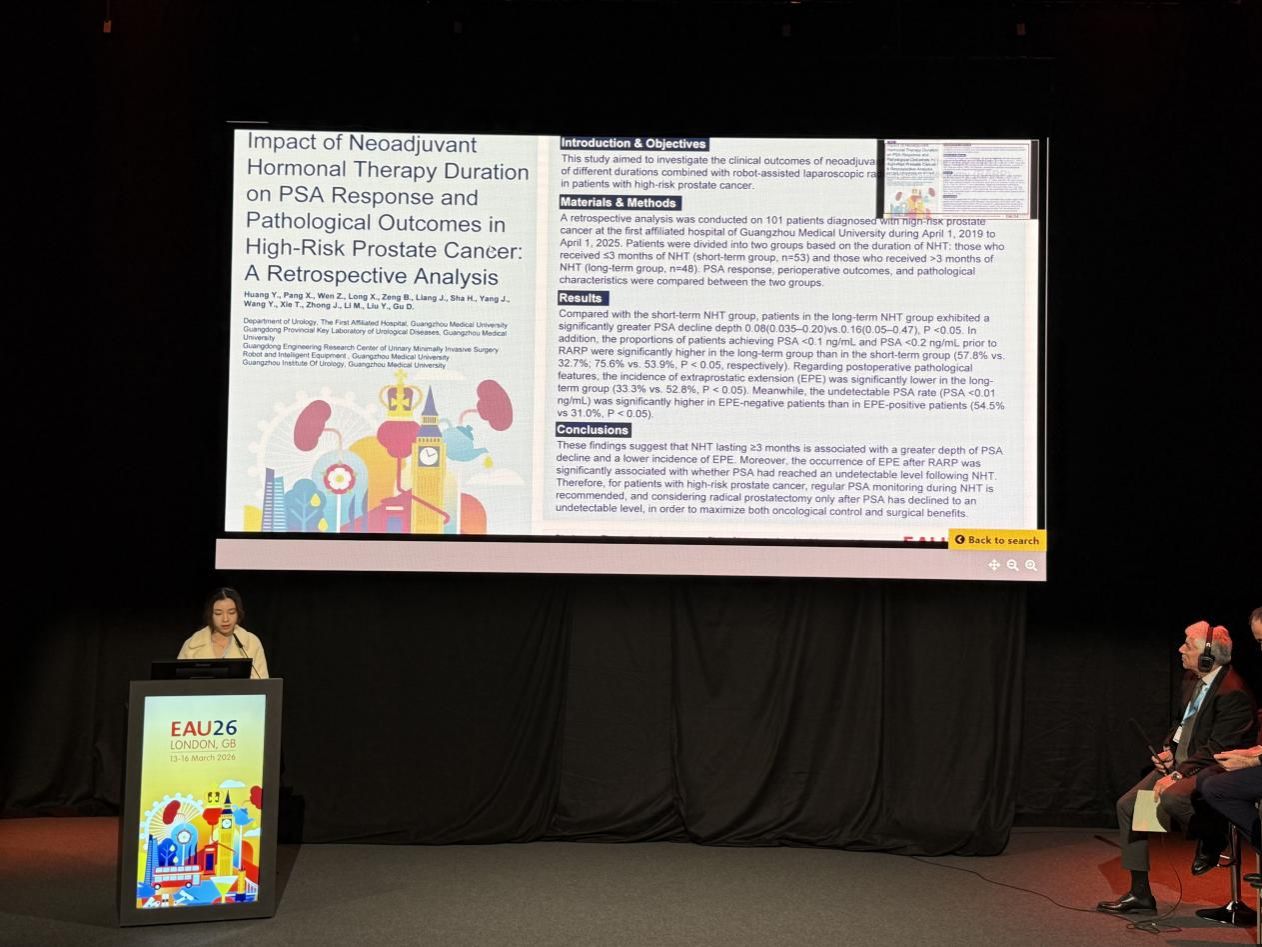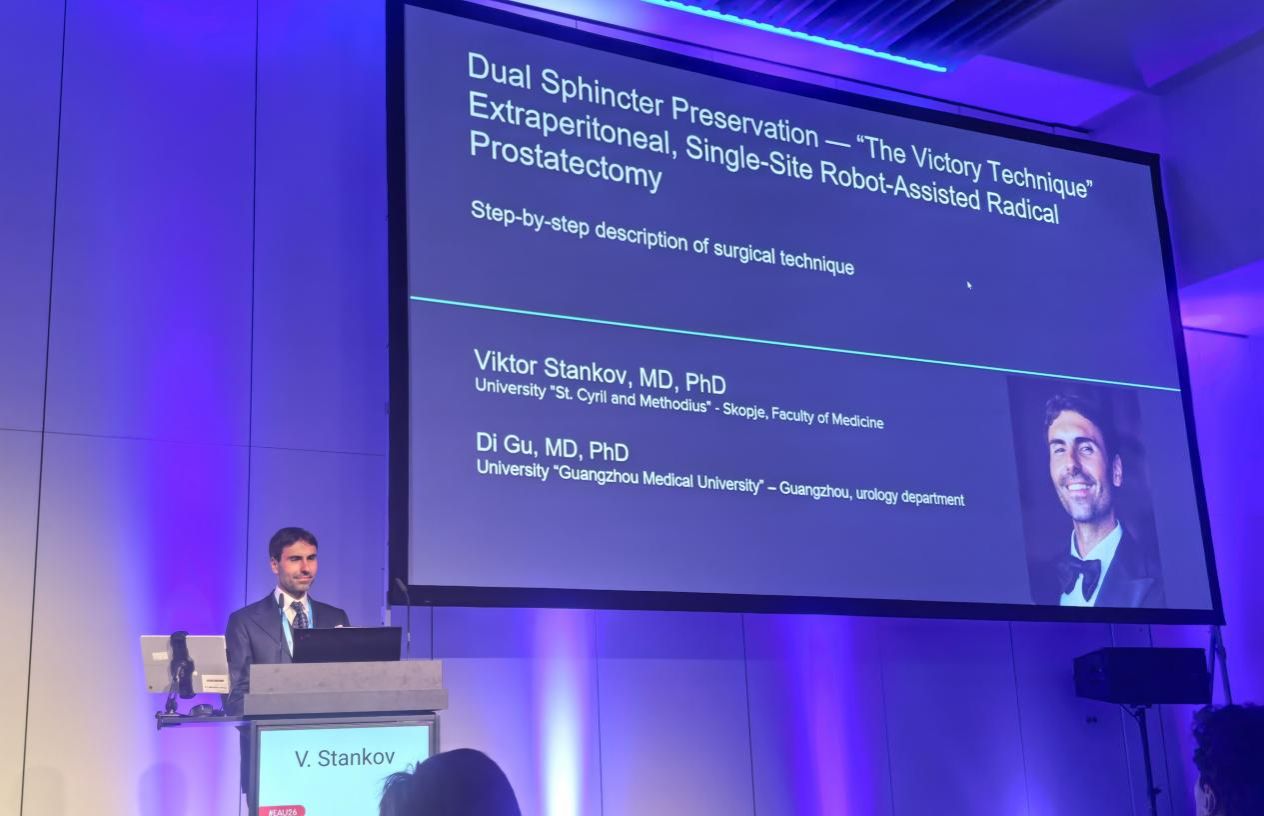 团队共收获5项口头报告和9项壁报展示:古迪教授介绍了中国社区PSA筛查与前列腺癌死亡率真实世界研究;Viktor Stankov医生展示了“Victory Technique”腹膜外单孔机器人辅助根治性前列腺切除术,显著提升术后早期尿控率。常正林博士后聚焦尿源性脓毒症早期诊断,黄悦婷、龙学智两位硕士生分别汇报了前列腺癌新辅助治疗及UTUC-zPDX模型研究,本科生张淇则探讨了膀胱癌免疫微环境机制。