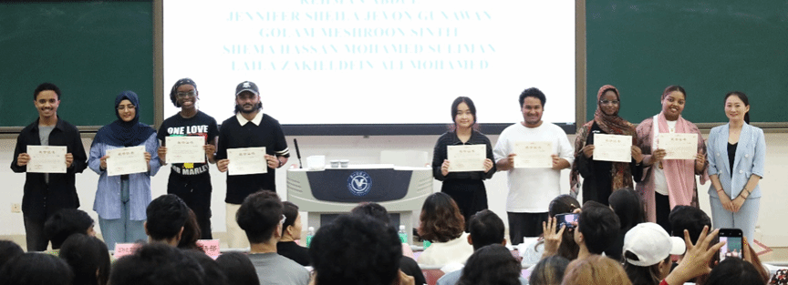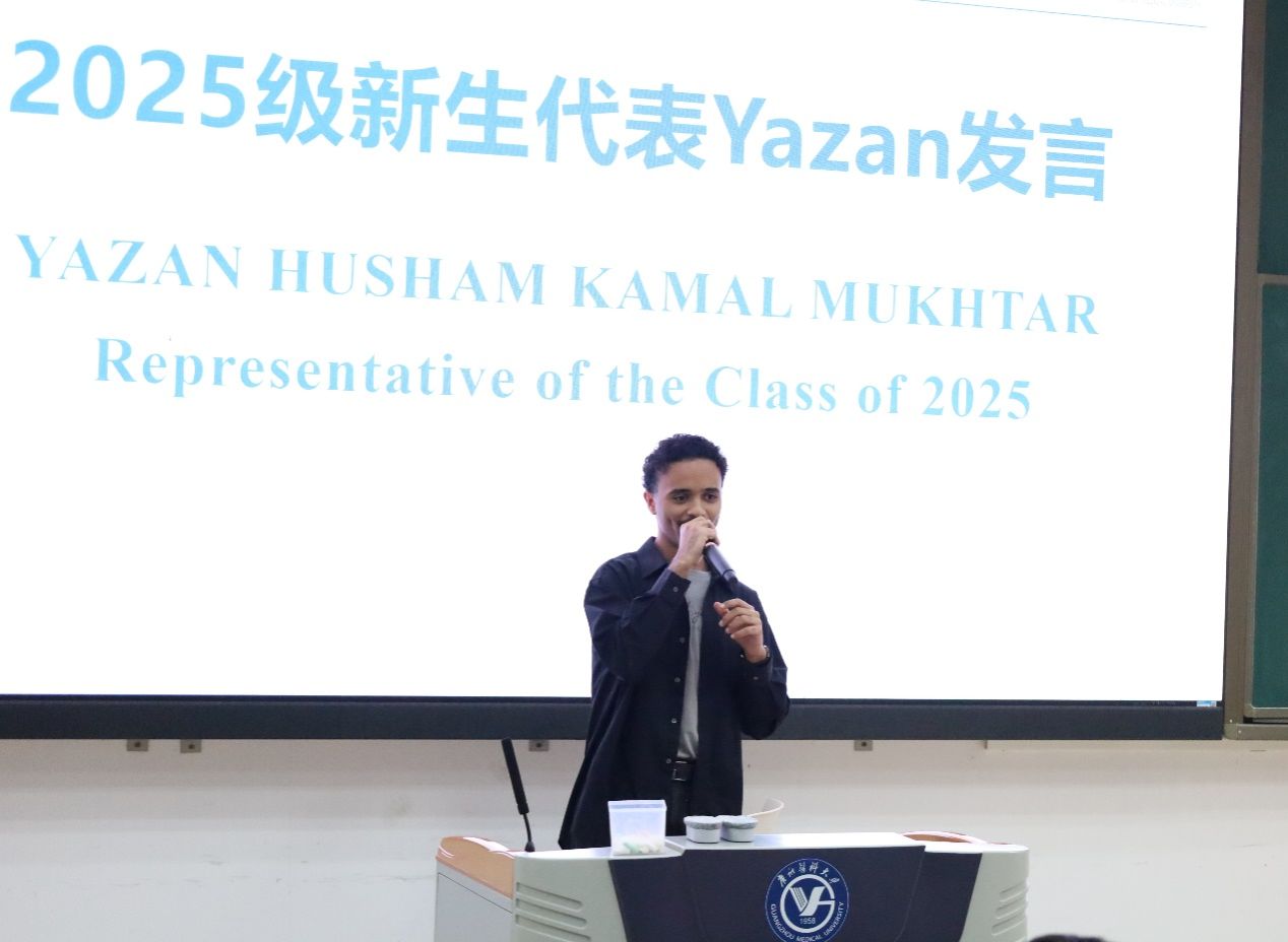 获奖学生代表发言。2022级KARKI SUGAM用中文分享他克服语言障碍、日积月累取得进步的经历;2025级YAZAN HUSHAM KAMAL MUKHTAR强调时间管理与高效学习的重要性。