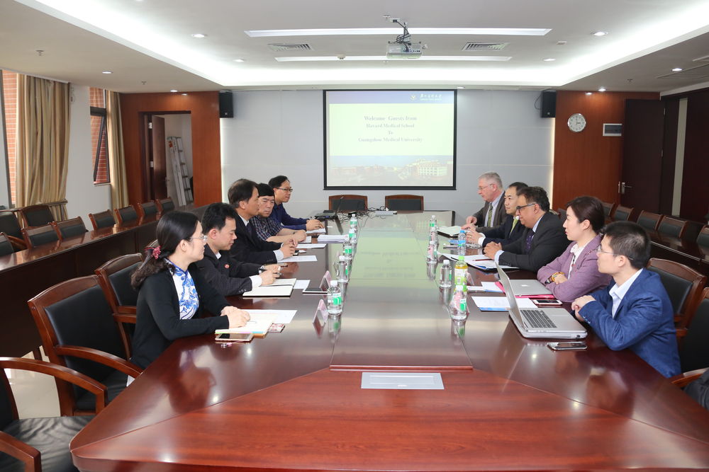 3月30日下午,美国哈佛医学院副院长Ajay K Singh、全球教育执行总监Robin J. Wheatley等一行5人访问我校。我校王新华校长、科研处王健处长、人事处黄宇翔处长、教务处郑建民副处长等部门与哈佛医学院代表团进行了合作洽谈。 王新华校长对哈佛医学院代表团的到来表示欢迎并介绍了广医近年的发展情况。哈佛医学院Ajay K Singh副院长简单介绍了哈佛医学院情况并表示哈佛医学院希望与我校建立友好合作伙伴关系。为促进我校高水平大学的建设,哈佛医学院可以为我校量身定做临床医生、教师、和科研人员培训项目。随后,双方探讨了建立广医-哈佛医学院合作平台的可能性。