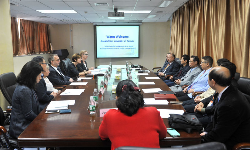 钟南山院士、附一院党委黎毅敏书记、何建行院长、呼吸疾病研究所陈荣昌所长、学校对外处吕嘉春处长等与多伦多大学医学院代表团进行了友好洽谈。双方就南山学院优秀毕业生联合培养硕士项目进行了深入洽谈。多伦多大学医学院Trevor Young院长表示欢迎我校南山学院的优秀毕业生报读该校医学院,培养优秀的医学人才。