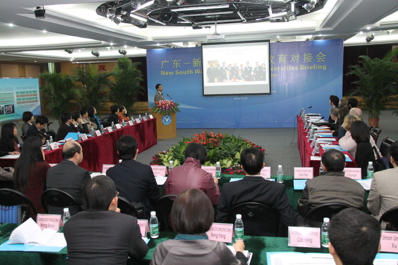 2012年11月27日,由广东省教育厅主办、广州医学院承办的“广东-新南威尔士州教育对接会”在我校体育馆三楼礼堂召开。本次对接会是广东省国际交流合作周的重要活动之一。澳大利亚新南威尔士州新南威尔士大学、纽卡素大学、麦克里大学、新州技术与继续教育学院代表等一行10人和来自广东省暨南大学、广东工业大学、广东技术师范学院、广东商学院等十二所高校的代表参加了会议;我校王新华校长出席了会议。会议由广东省教育厅交流合作处冯兴雷处长主持。