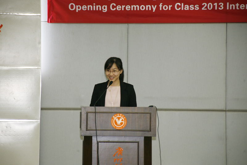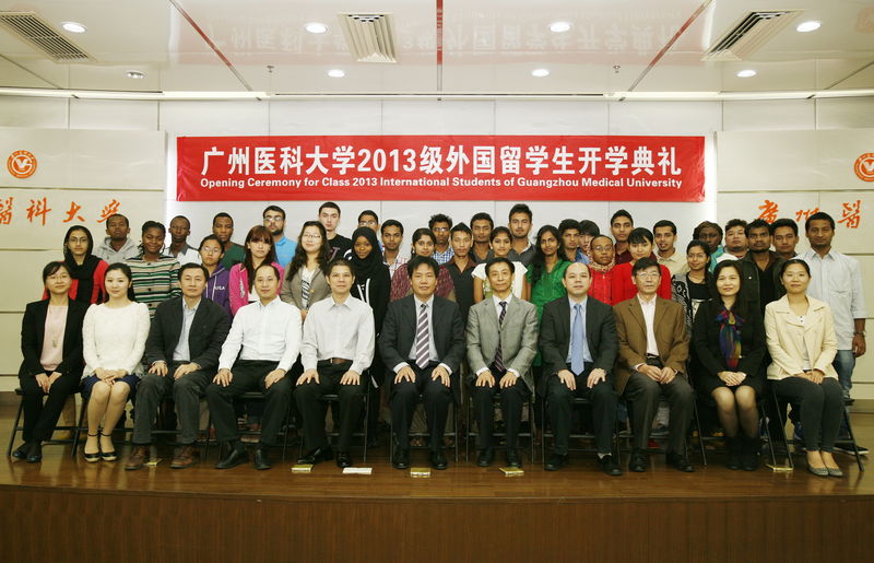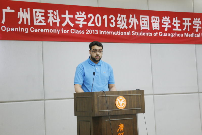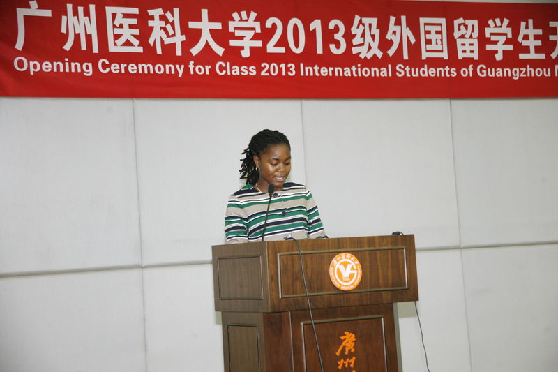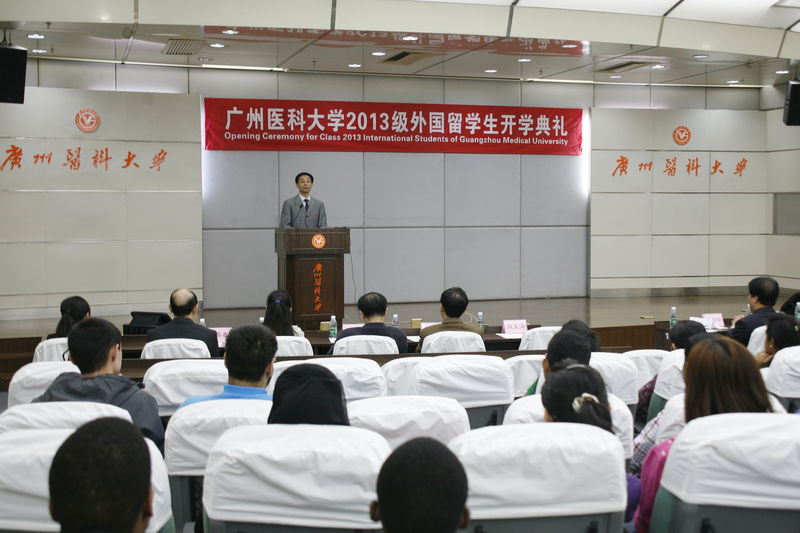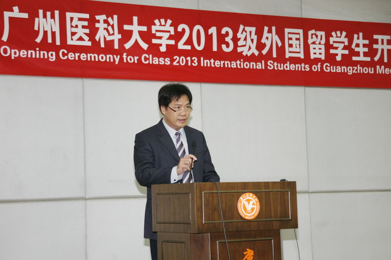 王新华校长在典礼上代表全校师生员工向2013级留学生新同学表示诚挚祝贺和热烈欢迎。他热情地向留学生新生介绍了广医的发展历程,并为留学生带来学校发展的好消息,广医将于明年搬迁大学城新校区,届时,留学生的学习和生活环境会有更大的发展,教学资源更加优化。最后,他对新生们提出三点希望,第一,遵章守法,遵守学校的规章制度;第二,珍惜当下,努力学习医学知识及技能;第三,加强跨文化沟通与交流,体验丰富多彩的留学生活。