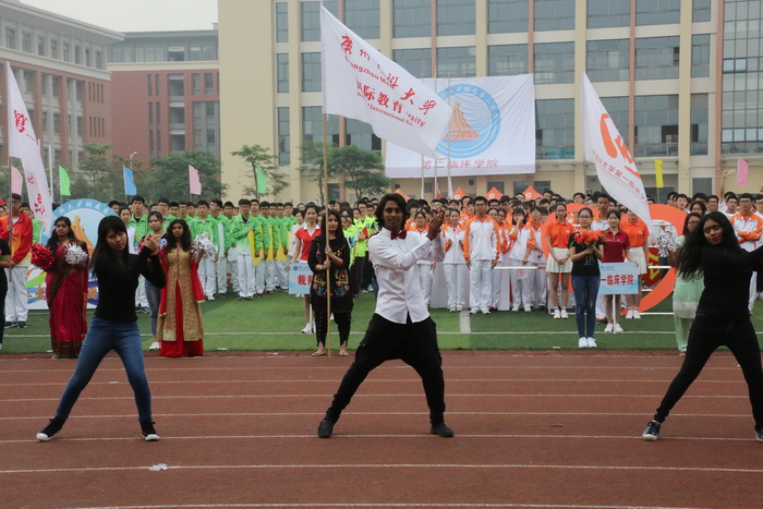 11月17日上午,广州医科大学第49届学生运动会在番禺校区运动场隆重开幕。图为国际教育学院留学生入场式表演。